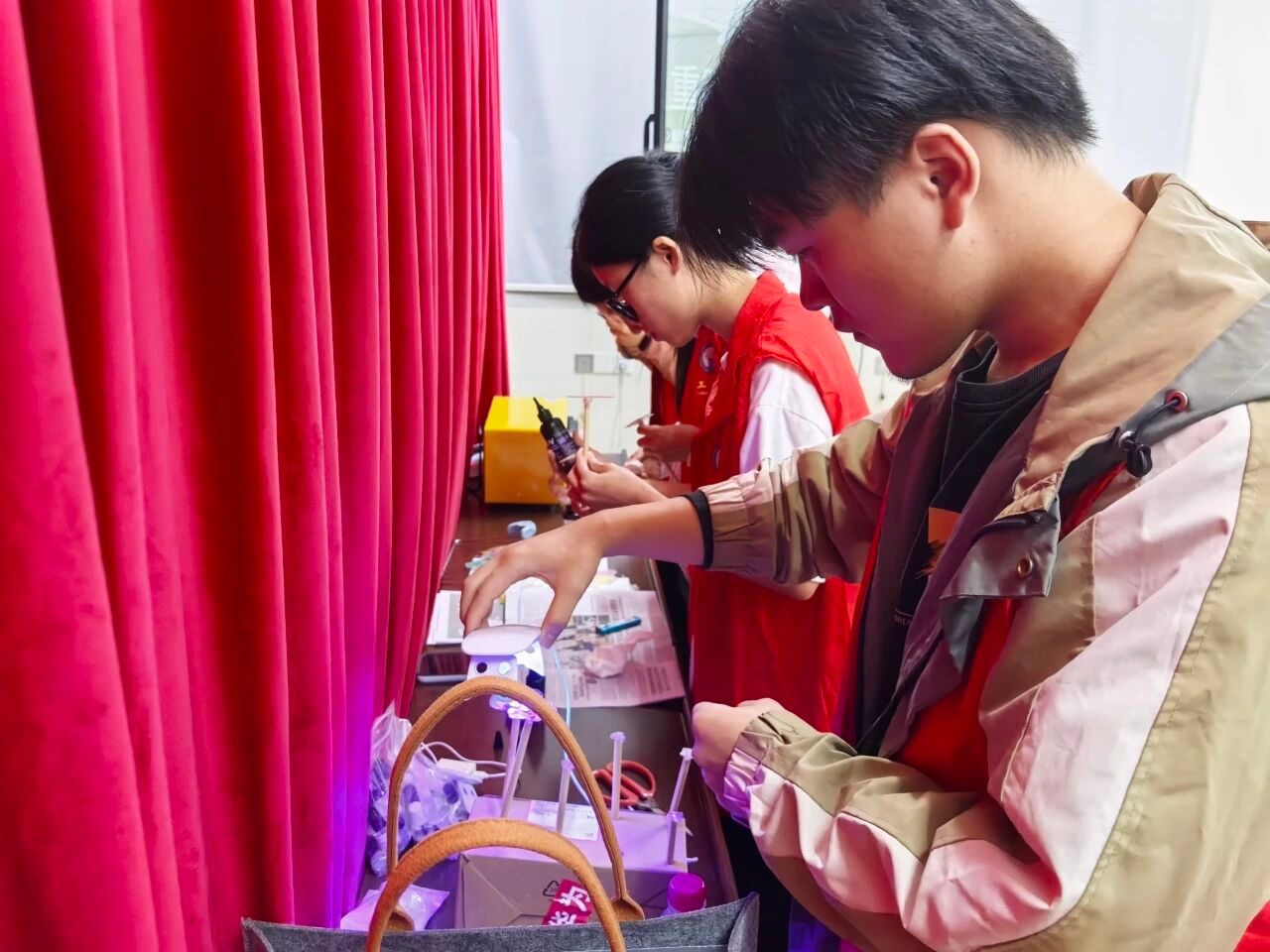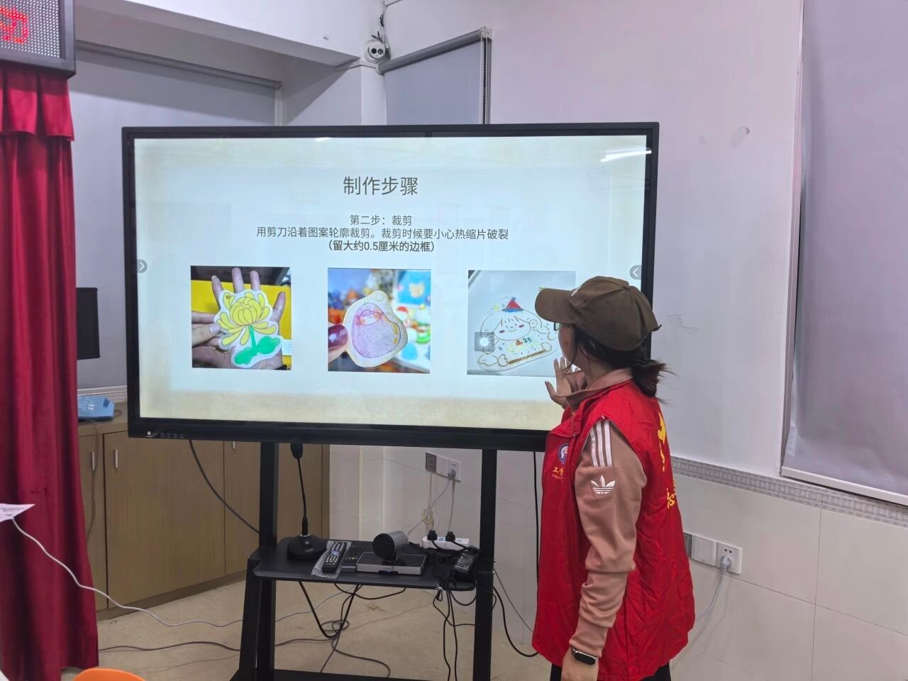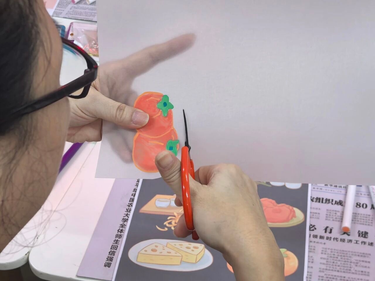 手把手教学,创意在指尖绽放在热缩片制作示范环节,志愿者们化身“小老师”,现场展示热缩片制作全流程。从在热缩片上用彩笔描绘菊、鹤、寿桃等吉祥图案,到用剪刀小心翼翼裁剪图案,选择是否预留挂孔,再到将裁剪好的热缩片放入烤箱低温加热至收缩定型,最后待热缩片冷却后粘贴挂链、背贴等装饰,每一个步骤志愿者都讲解得细致入微,操作得娴熟流畅。
