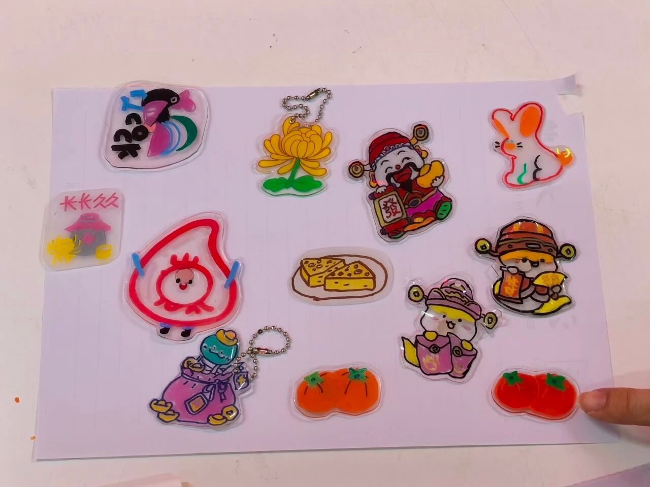 随着时间推移,志愿者与老人们陆续完成了自己的热缩片作品。仔细观察这些成型的热缩片,每一件都藏着独特巧思。描绘菊花的热缩片上,晕染的色彩因收缩变得更加浓郁,花瓣边缘的细微笔触清晰可见,仿佛一朵迷你菊花正悄然绽放;绘制卡通肖像的热缩片,人物轮廓虽缩小却依旧生动,眉眼间的神态被完整保留,成为承载思念的“掌心小画”。