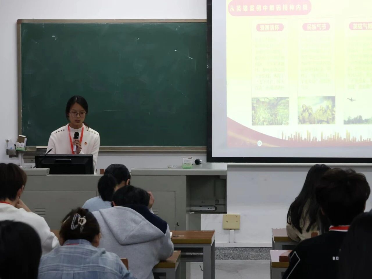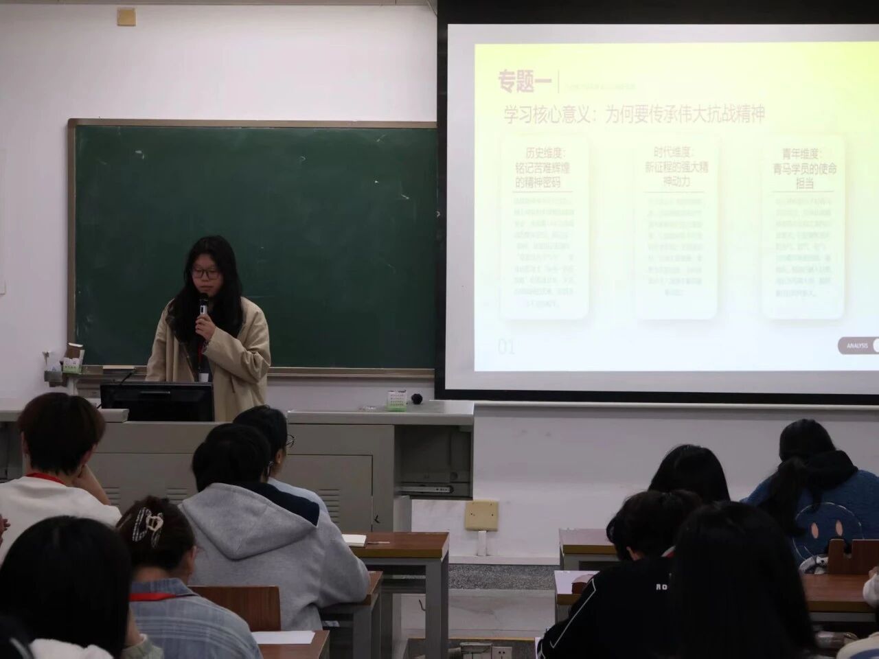 成果报告会上,同学们依据分组依次有序地开启学习与讨论内容的分享,其中第一小组成员围绕”抗战精神指引我们不忘初心,青年担当支撑我们奋勇前行,改革哲学为中国式现代化指明方向“的主题进行分享;第八组小组成员围绕专题内容讲述了陕甘宁边区的抗日故事,并制作视频分享了革命精神等。宋碧霄老师逐一点评了同学们的成果汇报。