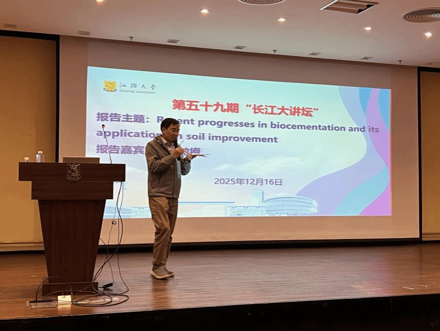 2025年12月16日下午,伟德国际victor1946党委宣传统战部和伟德国际1946亚洲版联合举办的第五十九期“长江大讲坛”在科技楼报告厅举行。南洋理工大学讲席教授、新加坡工程院院士楚剑教授受邀给汕大师生作主题为“Recent progresses in biocementation and its applications in soil improvement”的学术报告。伟德国际1946亚洲版经理沈水龙教授主持讲座。