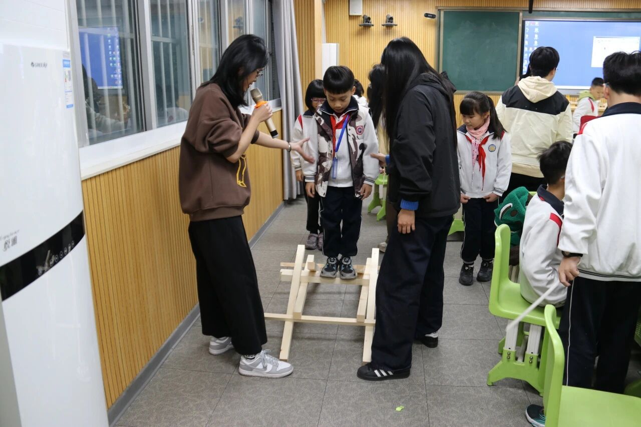 而将整个动手环节推向高潮的,是志愿者们现场搭建的一座大型“倍力桥”。该桥以多根木棍交错搭建而成,结构稳固、造型美观,充分展现出桁架结构特有的力学之美。在志愿者的引导和保护下,小员工们依次走上桥面,亲身感受桥梁在承重时的稳定与坚固。站上自己所学过的桥梁结构,孩子们既兴奋又专注,直观理解了桥梁如何通过合理的结构分布荷载、保障安全。此次活动不仅锻炼了他们的动手能力与协作意识,更让桥梁设计的智慧,在孩子们心中埋下了实践的种子。