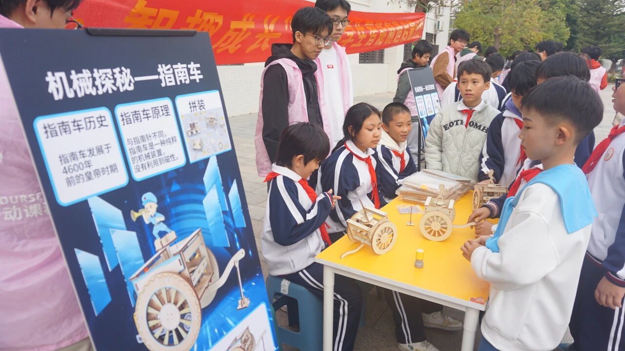 “小讲师”们借助实物模型,还原了古人无需依赖现代导航、仅靠机械原理实现定向的智慧结晶。同学们转动指南车,观察其在不同方向转动后仍能精准指向南方的神奇特性,在动手实践中领略传统机械的精妙设计。