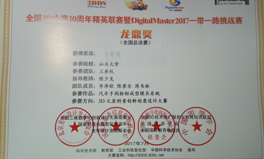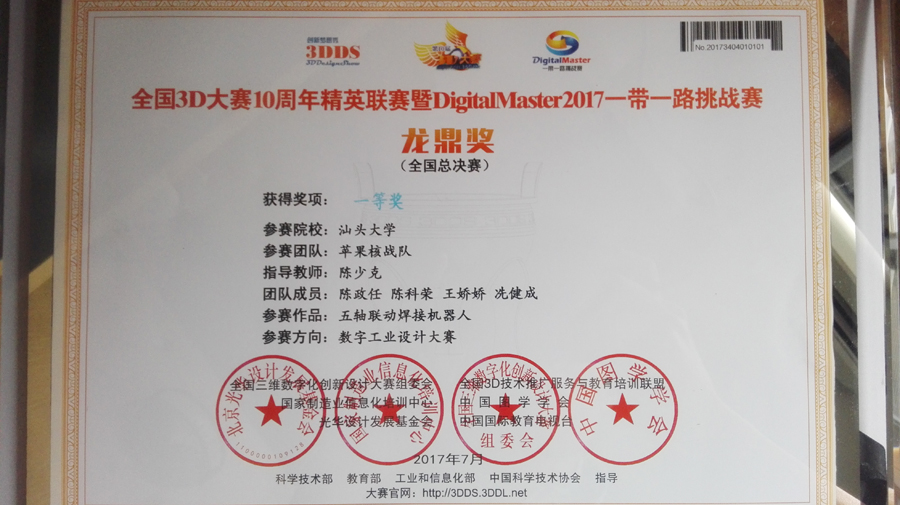 7月20日至24日,“2017丝绸之路科学节·全国3D大赛10周年精英联赛暨DigitalMaster2017一带一路挑战赛”现场决赛在克拉玛依市举行。在陈少克教授的指导下,伟德国际1946亚洲版陈科荣和陈景乐同学分别代表两个团队参赛。经过作品展示与答辩环节,陈政任、陈科荣、王娇娇、冼健成团队的项目“五轴联动焊接机器人”获得一等奖,李泽钦、陈景乐、周韦林团队的项目“汽车手刹按钮成型模具系统”获得三等奖。