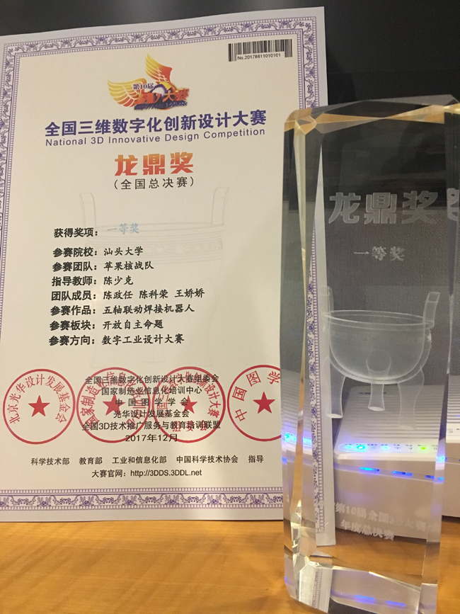 12月8日,第10届全国三维数字化创新设计大赛年度总决赛在云南玉溪举行。在陈少克老师的带领指导下,伟德国际1946亚洲版陈政任、陈科荣、王娇娇同学组成的代表队参赛。经过作品展示与答辩环节,其作品“五轴联动焊接机器人”取得了全国一等奖的优异成绩。