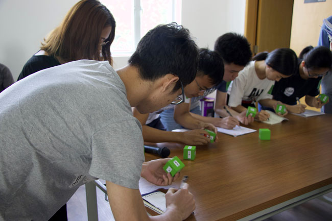 下午的项目在项目教练带动现场活跃气氛中开始了。下午进行了第二个项目——“超级骰子”,要求小组协作观察桌上的骰子,然后找出规律,进行排序。意在训练同学们的团队合作、主动沟通及合理计划。每个同学仔细观察自己手中的骰子并记录下来,小组讨论找出骰子的规律,力争用最少的时间成本创造最大的收益。