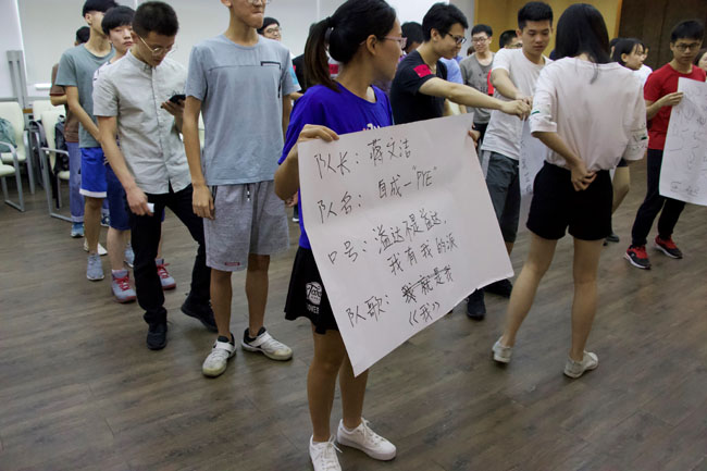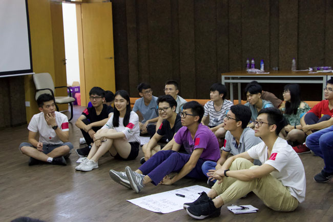 此次活动分为上午及下午两个阶段。上午,溢达集团的HR向同学们介绍溢达集团的基本情况后,项目教练带领同学们进行破冰游戏,让同学们相互熟悉。将同学们分为四组,每组同学共同协商选出队长,并决定队名、队歌及口号。