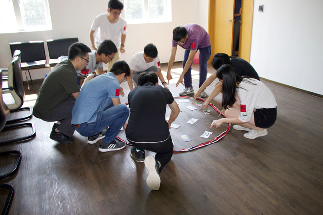 然后,开始第一个项目——“急速60秒”,要求小组协作寻找圆圈中卡片的排序规律,然后在60秒内依次将卡片捡起,意在培养同学们的领导能力、开拓思路及主动反馈能力。