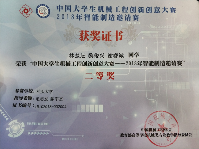2018年11月30日—12月2日,中国老员工机械工程创新创意大赛—2018年智能制造邀请赛在同济大学圆满举行,经过两天激烈角逐,汕大机电系员工林楚坛、黎俊兴和数学系员工谢睿诚在机电系毛忠发和陈军杰老师的指导下,荣获全国二等奖的佳绩。