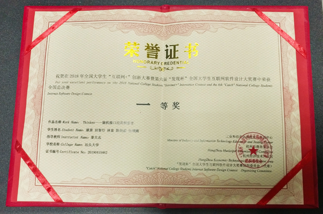 由伟德国际1946亚洲版计算机系姜大志老师指导,漆原、田智行、林富、陈剑威、张塽旖同学组成的原生范团队的作品“Thinker——脑机接口应用探索者”在此次总决赛中获得大满贯,分获全国一等奖和“最具投资价值”创业大奖,姜大志老师获得优秀指导教师奖。