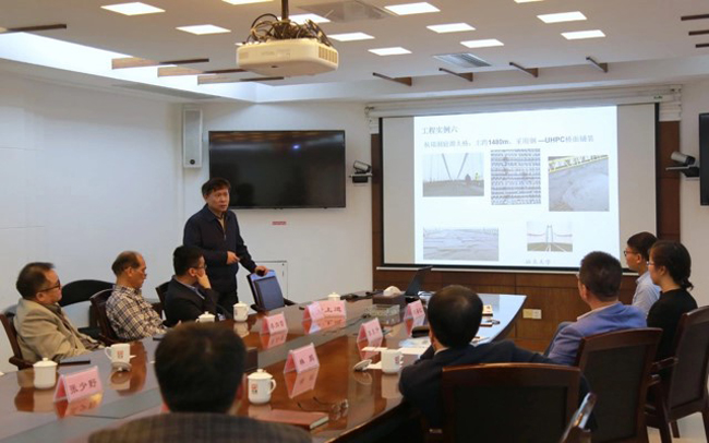 土木系骨干教师同联泰集团高管及下属的达濠市政、联泰环保、联泰交投、设计院及咨询公司等各板块负责人进行了技术座谈,就工程技术中心的建设和发展及企业发展过程中遇到的科研技术难题进行了深入的交流。几位教师就当前的相关研究课题做了介绍和分享:祝志文教授讲解UHPC 在大跨度桥梁工程中的应用,李东升教授讲解了结构健康监测应用案例,宋海红副教授介绍练江流域治理的最新研究进展,王延宁副教授介绍地基沉降远程监测系统的技术应用,王传林博士介绍了装配式建筑研究进展。