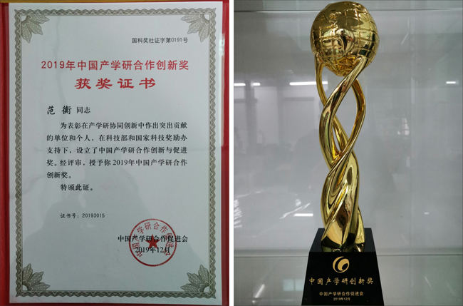 图4 范衠教授获2019年中国产学研合作创新奖获奖证书和奖杯