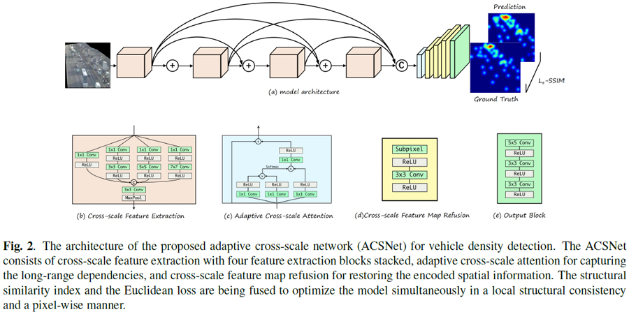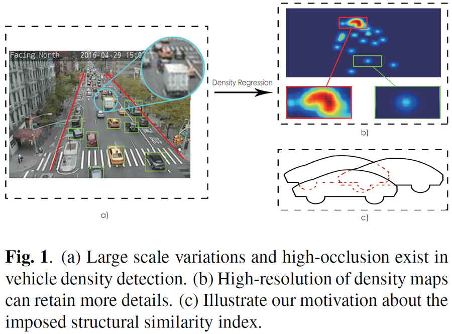 该研究聚焦于交通拥堵分析中的一项基本但具有挑战性的任务——车辆密度检测。基于视频帧所捕获的交通监控具有分辨率低,尺度差异大的特质,该项研究提出了一种新的车辆密度检测网络模型。该模型可以通过提取跨尺度特征来恢复高质量的密度图,以此完成精准的车辆密度检测。研究首先提出使用一系列跨尺度特征提取模块获取空间特征,同时,在训练过程中采用密集跳层连接有效缓解训练的梯度消失等问题。研究还通过一个自适应注意块自适应关注信息量大且不同的特征图。为了避免引入外部计算增加整个网络的复杂性,该项研究只在网络最末端对特征进行融合。此外,研究还受到人类视觉系统的启发,引入了结构相似性指数来处理高遮挡下的物体识别。