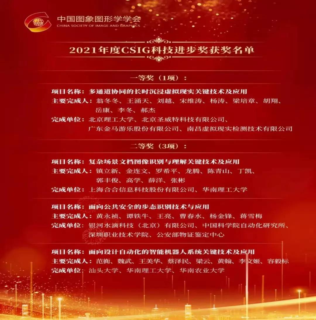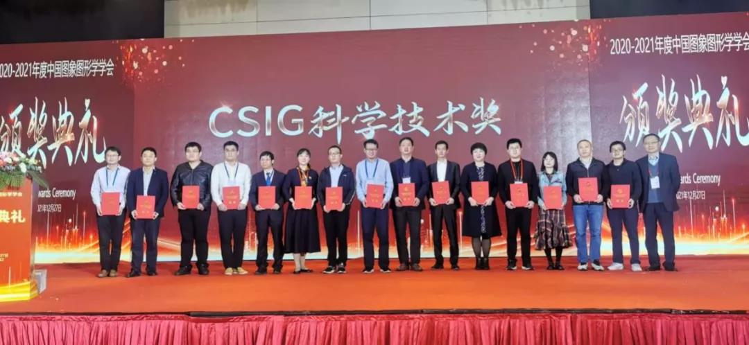 中国图象图形学学会会士是本学会最高学术荣誉,以表彰在图像图形科学技术领域取得卓越成就和为学会作出突出贡献的学会会员。CSIG自然科学奖、技术发明奖、科技进步奖于2018年设立,授予我国图像图形学领域的重要理论、技术和产业成果,旨在通过奖励机制充分调动我国图像图形学科技工作者的积极性和创造性,推进图像图形学技术领域的科技创新与产业发展。2020和2021年度共评选出CSIG自然科学奖9项、CSIG技术发明奖6项,CSIG科技进步奖4项,学会理事长王耀南院士、副理事长王涌天教授为获奖者颁发证书。作为中国图象图形学学会科技进步奖的获奖单位之一,伟德国际victor1946受邀参加本次会议,并由蔡泽民老师和容毅标老师作为获奖代表上台领奖。