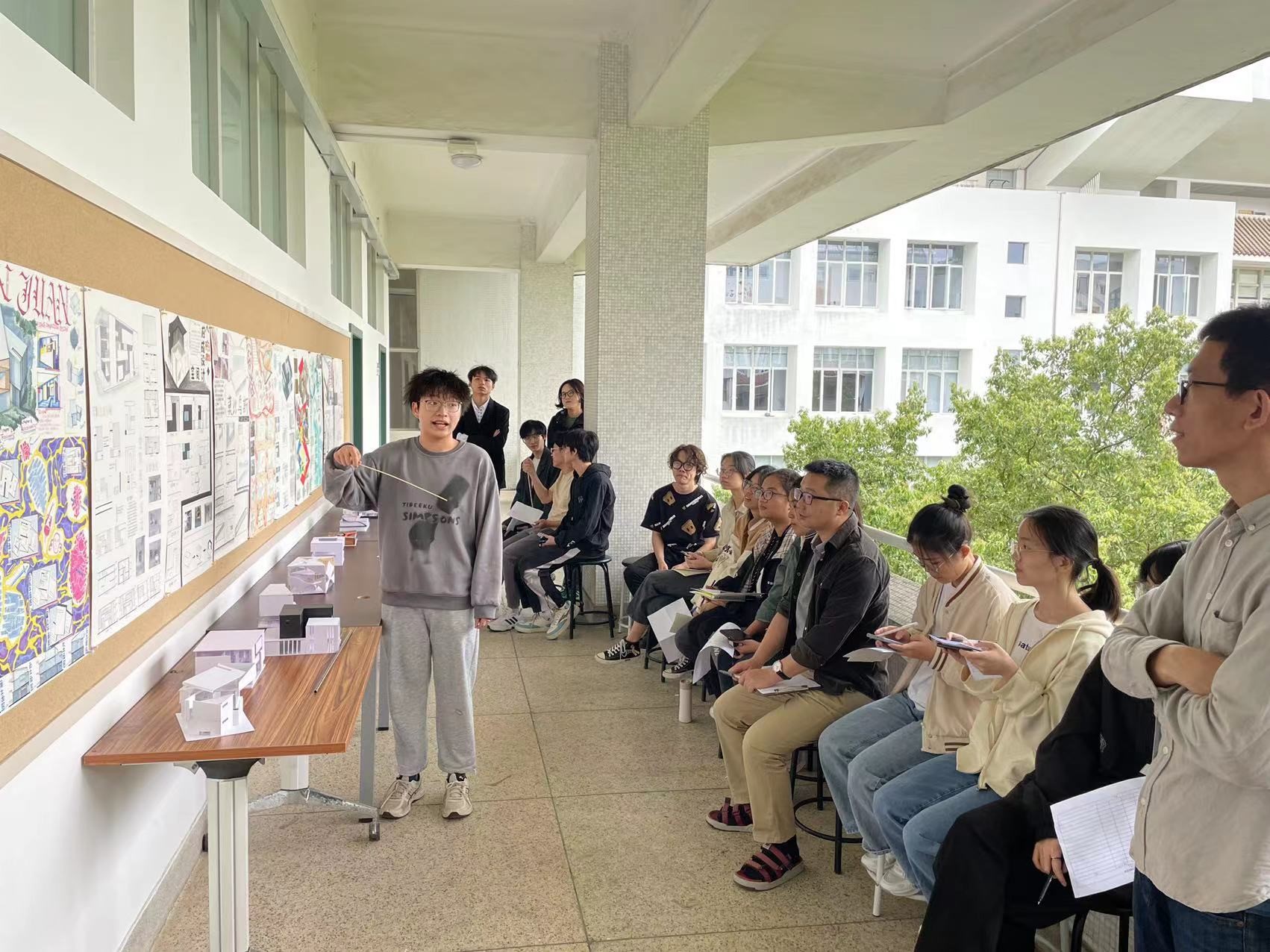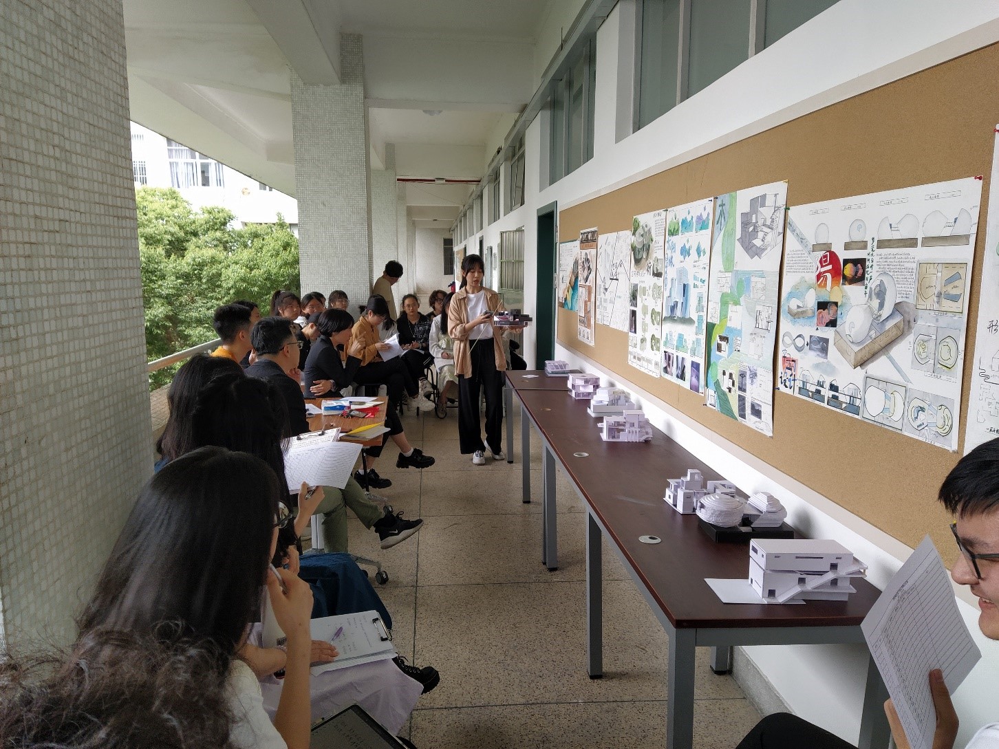4月23日,一个阳光明媚的周末上午,刘文卿和张翠娜老师的建筑设计原理与设计课程在工西三楼走廊开始了评图课堂,对同学们用半个学期做的设计进行点评交流。
