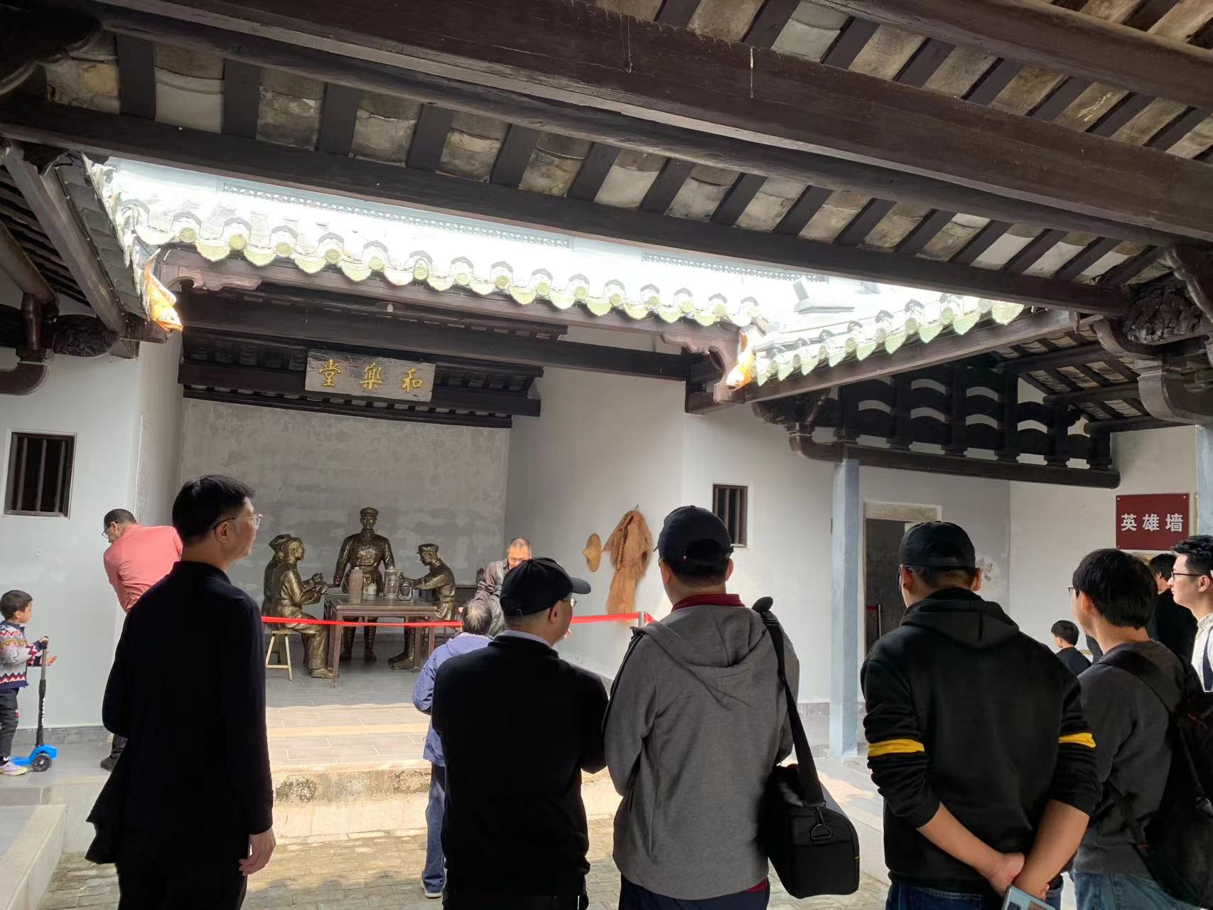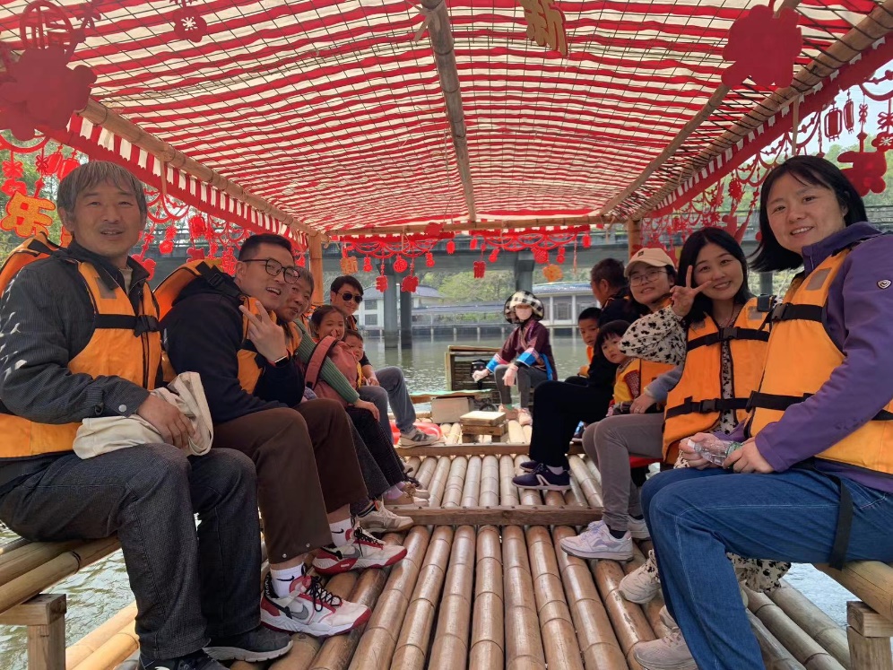 一个半钟的车程在闲聊中一晃而过,我们来到揭西县南山镇海陆丰革命老区火炬村,这是一片富有革命传统的红色土地。大家参观了潮汕人民抗征队司令部,后勤部、兵工厂、武器弹药仓库、潮汕军政法庭、看守所及后方医院。此时,这里的三角梅开的正艳,红红火火映衬着当年潮汕人民顽强革命和抗日精神的强大生命力。随后,我们来到了风光秀丽的揭西县京溪园镇京明度假村,2200亩生态优质茶整整齐齐,是山峦之间亮丽的绿色风景。林间偶尔出现三两在凉亭喝茶的人,以山为友,以鸟为伴,羡煞旁人。老师们没时间喝茶,来个竹筏,湖中漂流也是个不错的体验。湖水碧绿、鱼儿不断探出水面,引起了孩子们的好奇,还有零星的或许是离群的小鸭子,略显惊慌地扑腾着小掌,也给旅人带来无限的乐趣。午饭过后,大家来到大鹿村大鹿农业公园。公园里桃花,黄花风铃木、紫薇花、金茶花、樱花等争妍斗艳,让人流连忘返。另外,莫问壶,爱心长廊,紫滕长廊,瞭望台等景点也吸引了不少人去拍照。
