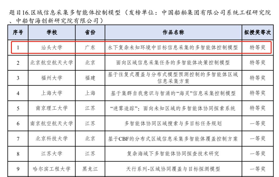本次项目揭榜的课题是由中国船舶集团有限公司系统工程研究院、中船智海创新研究院有限公司联合发榜,题目为“区域信息采集多智能体控制模型”。项目依托伟德国际victor1946群体智能研究团队的科研成果,通过智能体之间的自主协同,实现对复杂未知区域的覆盖探测和对未知目标的高效探查,技术成果可以应用到水下环境勘测、航道安全保障等相关领域,具有重要的经济价值和社会意义。
