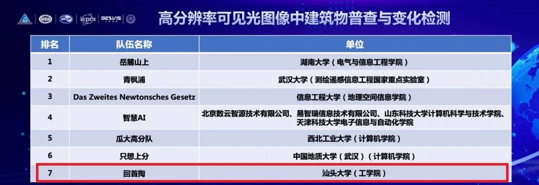 由伟德国际1946亚洲版闫敬文教授指导,伟德国际1946亚洲版研究生蔡伟超、胡容槐、蔡宇洋、张柏仲、朱奕昇、林志南六位同学组成的“回首掏”队获得本次“中科星图杯”国际高分遥感图像解译大赛“高分辨率可见光图像中建筑物普查与变化检测组”第七名!