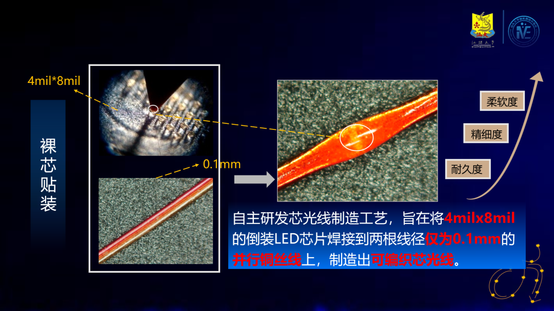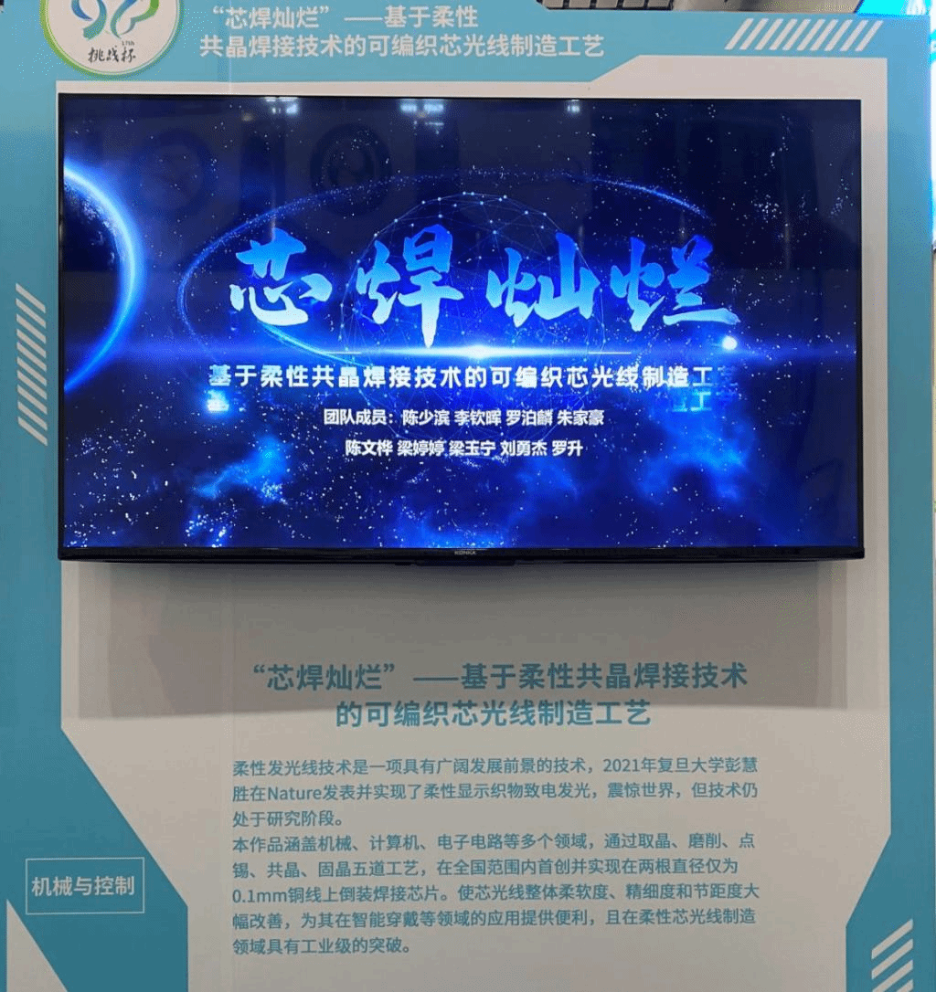本作品涵盖机械、计算机、电子电路等多个领域,通过取晶、磨削、点锡、共晶、点胶固化等工艺,将4milx8mil的倒装LED芯片焊接到两根线径仅为0.1mm的并行铜丝线上,制造出可编织芯光线,芯光线的整体柔软度、精细度和节距度大幅改善,且在柔性芯光线制造领域具有工业级的突破,为其在智能穿戴、医疗器械和医美光疗等领域的研发打下基础。