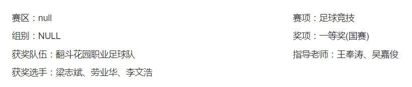 历经省赛和全国总决赛,梁志斌、劳业华、李文浩组成的“翻斗花园职业足球队”获得了全国一等奖;蔡子轶、吴嘉丽、李健晖组成的“功夫足球”队与陈振国、曾令山、陆俊成组成的“第十一个前锋”队均获得了全国三等奖;梁创楗、陈颖、严日鸿组成的“STU_NEO”队获得了省级三等奖。