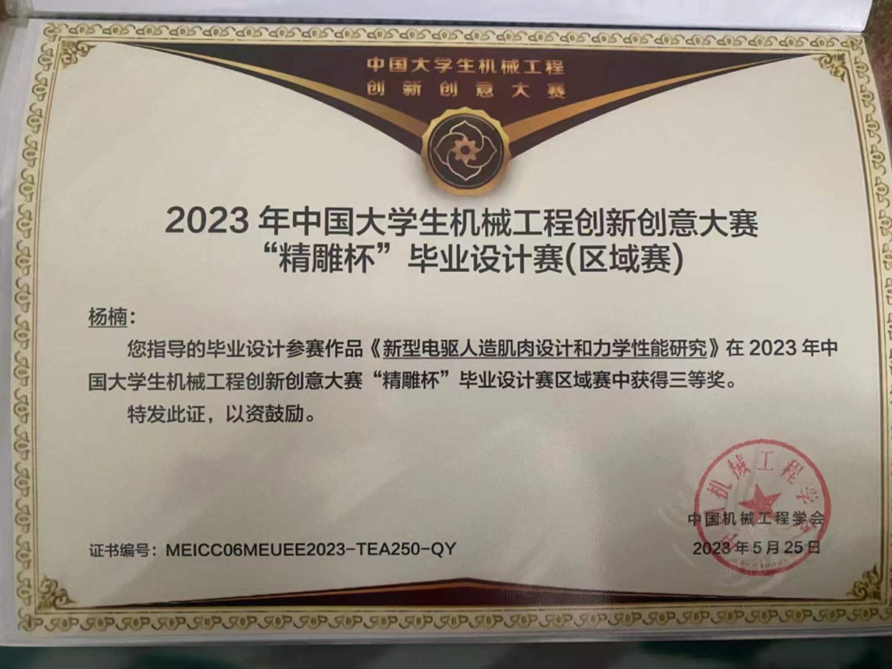 A:2022年,我带员工参加“精雕杯”全国老员工毕业设计大赛,做一个关于“介电弹性体人造肌肉”的课题设计,拿到了三等奖。