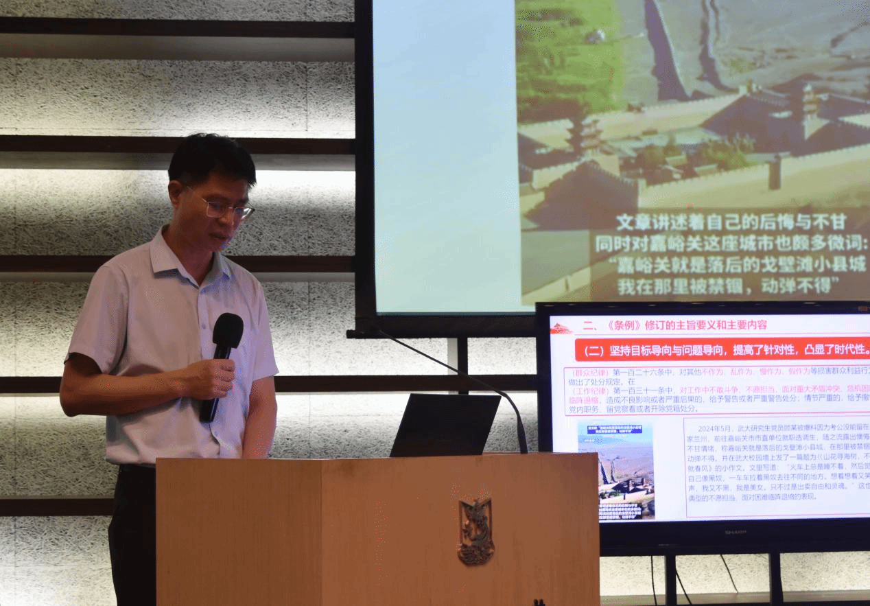 郑再新以“学纪知纪强党性,明纪守纪建新功”为主题,从《条例》修订的背景与意义、主旨要义与内容及如何学习贯彻三方面为毕业生党员讲授最后一堂党课,并围绕政治纪律、组织纪律、廉洁纪律、工作纪律、群众纪律和生活纪律六方面的反面案例,以案说法、以案说德、以案说责。郑再新向全体毕业生党员提出了三点要求:一是提高政治站位,增强学习贯彻《条例》的自觉性和坚定性;二是把握精髓要义,全面推进自我净化、自我完善、自我革新、自我提高;三是坚持知行合一,心怀“国之大者”,在中国式现代化建设中挺膺担当。