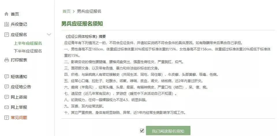 选择报名阶段确定后,会弹出男兵应征报名须知,请仔细阅读对照自身条件是否符合。