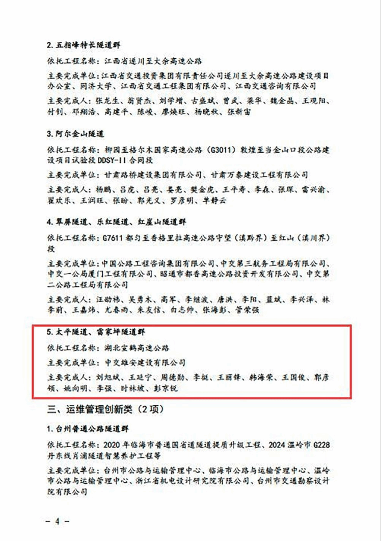 中国公路学会于2022年设立“隧道与地下空间工程创新奖”,专门授予我国最具创新性的隧道与地下空间工程。该奖项包含3个类别,其中“施工建造创新类”用于表彰工程施工过程中采用具有创新性的施工工艺、技术和设备的杰出项目,2024年全国仅有10个工程项目获评。王延宁针对太平-雷家坪隧道群中特大型溶洞的安全建造科技创新工作得到业界的高度认可。