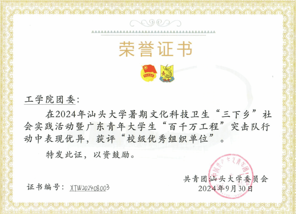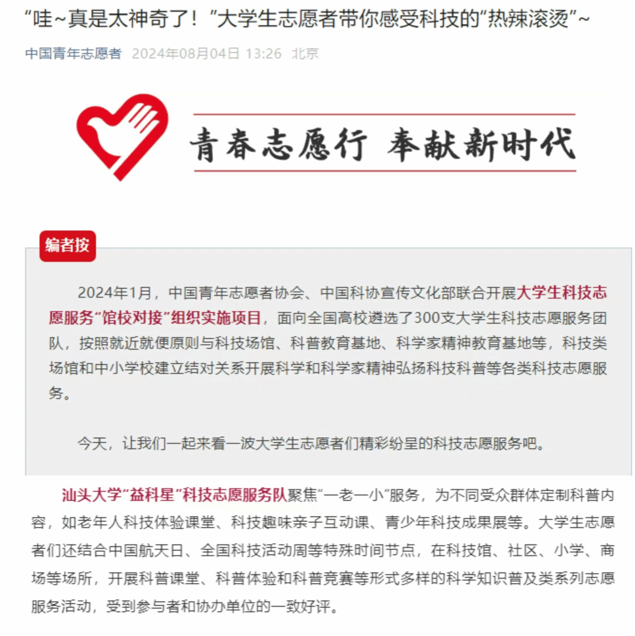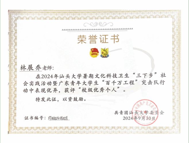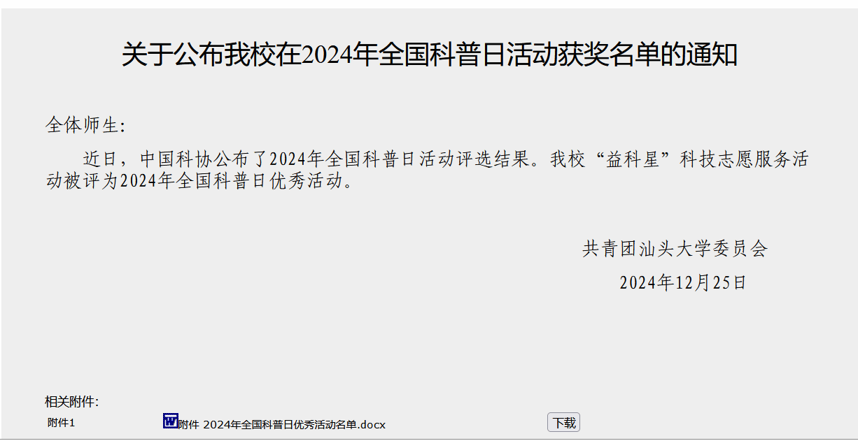 2024年2月,“益科星”科技志愿服务队入选2024年全国老员工科技志愿服务团队,目前已开展系列活动18场次,活动受到中国青年志愿者2次报道,县市级以上平台报道19次,累计活动关注量25446人次,累计参与人数3000余人,并获评广东青年老员工“百千万工程”突击队行动校级优秀集体,伟德国际1946亚洲版团委获评校级优秀组织单位,指导老师林展乔获评广东青年老员工“百千万工程”突击队行动校级优秀个人。2024年12月,“益科星”科技志愿服务活动荣获“2024年全国科普日优秀活动”和广东青年老员工“百千万工程”突击队行动典型案例。