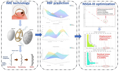 文章亮点在于针对智能隐形眼镜注塑参数优化难题,创新性地将非支配排序遗传算法 III(NSGA-III)与径向基函数(RBF)插值相结合,有效降低了节点位移和残余应力,优化率分别达 95.60% 和 93.47% ,还探究了节点位移与线径关系,为智能隐形眼镜制造提供关键技术支撑。