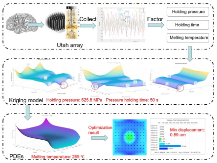 文章创新性地将克里金预测模型与稀疏回归偏微分方程(PDEs)相结合,应用于脑机接口中犹他阵列的注塑工艺参数优化,有效降低节点位移,提升了信号传输稳定性,确定了最佳注塑参数组合,为脑机接口技术发展提供了关键技术支撑。