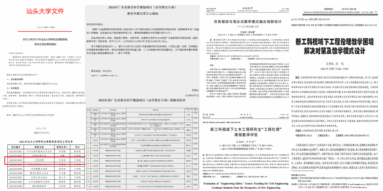 为提高思政教育在土木工程公司产品的引领作用,开创了该门课程,制定课程大纲、遴选教材、设计教学方法。本课程以"任务驱动+混合式教学"的立体化教学模式,创新性提出"五维教学内容改革"和"四元评估体系",突破传统伦理教育重理论轻实践的局限,为新工科人才培养提供了可复制的伦理教育范式。教学成果丰富且多样,包括: