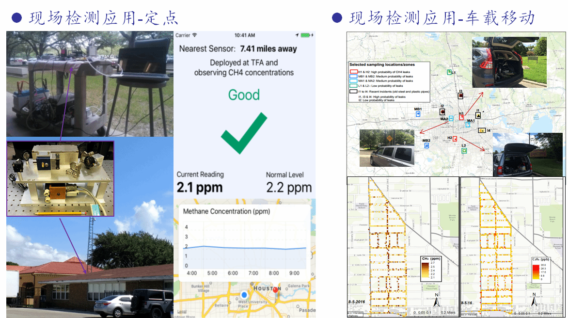 针对移动探测中时变噪声干扰导致测量误差大的问题,提出了电域噪声动态感知多通道自适应算法,测量误差小于5%,甲烷探测下限(MDL)为9 ppm(百万分之一);针对移动探测中气压波动致吸收线型畸变问题,提出洛伦兹线型拟合补偿算法,实现了免压控条件下甲烷MDL达到2.25 ppb(十亿分之一);针对开放环境泄漏源定位难的问题,融合风速风向等物理信息参量构建高斯烟羽模型,溯源误差<8%;针对大气烷烃气体实时监测需求,研制了中红外甲烷传感系统,以定点方式对社区甲烷浓度开展了为期3个月的实时监测;针对城市多组分气体同步检测需求,研制了甲烷/乙烷同步探测系统,实现城市8个街区为期两个月的车载移动测量;针对深海可燃比勘探需求,研制了海水溶解二氧化碳气体传感系统,在南海神狐海域开展了水下2000米的原位探测。