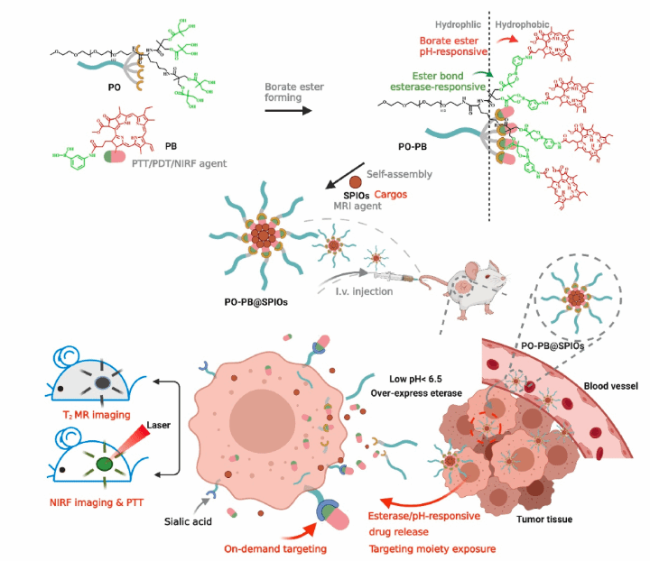 纳米载体在提高肿瘤药物递送效率和治疗效果方面具有巨大潜力。然而,药物过早渗漏和非特异性靶向性仍然限制了递送效率。基于此,笔者设计了一种新的线型-树枝状聚合物分子结构,用顺式二醇对线型聚乙二醇-树枝状聚合物末端改性,并用其直接装载苯硼酸卟啉和 SPIO 来制备纳米探针。这种聚合物一方面能够通过硼酸酯键将功能分子牢牢锁住在胶束内部,防止其过早渗漏,另一方面又具有良好的pH响应性和可降解性,能够实现胶束在肿瘤部位的响应性释放。