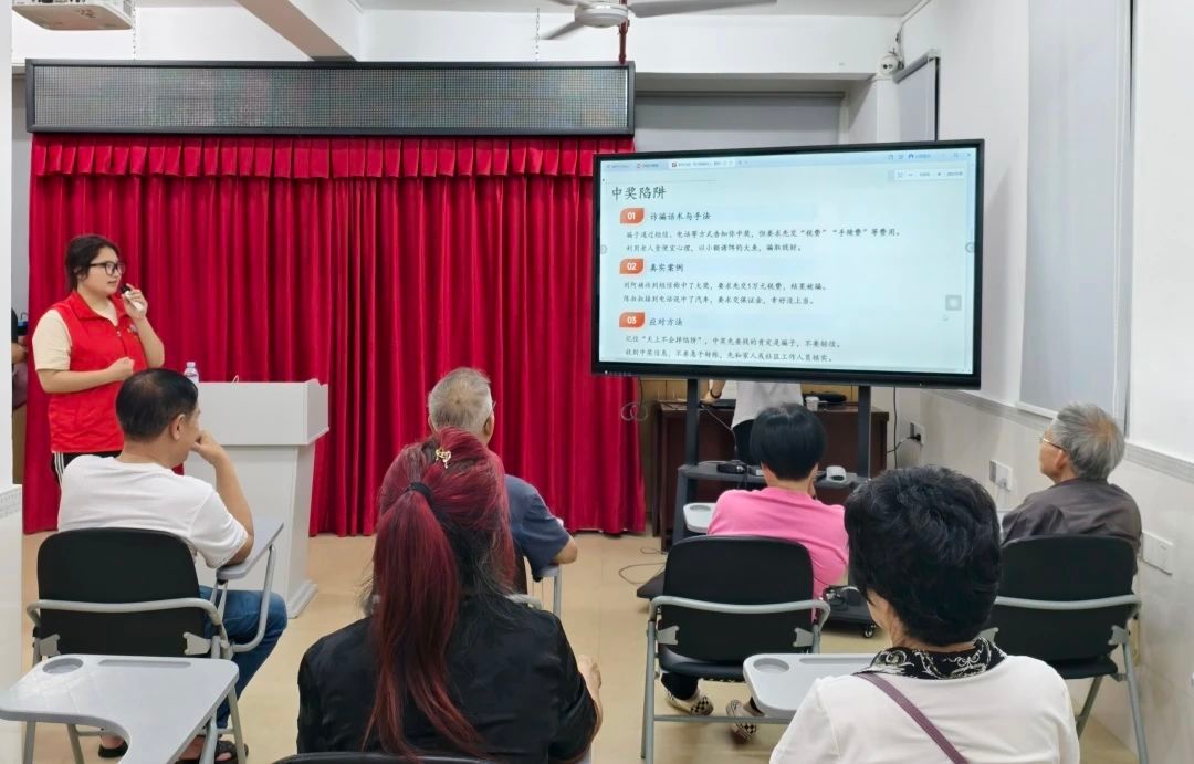 随后,宣讲团成员面向社区老人开展防诈骗知识科普,详细讲解了生活中常见的诈骗套路和社区老人易遭遇的诈骗类型。再通过通俗易懂的案例化表达,将生活中常见的诈骗套路、社区老人易遭遇的诈骗类型以及真实发生的诈骗案例串联起来,帮助老人们深入理解防诈骗知识,引导老人们结合所学内容深入思考如何在生活中保持警惕、守护自身安全。