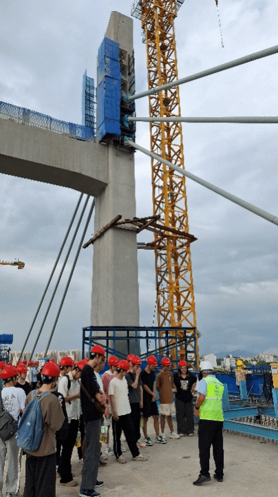 2022级土木工程专业的区紫莹同学说:走进中铁二局澄海制梁场,预制梁生产的全流程清晰展现。定位网半自动焊接机等创新工艺的应用,让人直观感受到技术革新对施工效率与质量的提升——机械替代部分人工作业,精度更高、流程更稳。钢筋焊接、混凝土浇筑、预应力张拉等环节环环相扣,每一处细节都体现着标准化与规范化的力量。而新津河斜拉桥的施工建设,更是体现了工程师们的卓越智慧。此次参观,让她对现代桥梁建设有了更深的敬畏。从智能化的制梁工艺到严谨的施工现场,从创新技术的应用到建设者的专业专注,无不彰显着中国基建的扎实功底。在她看来,这份躬行实践的精神,正是推动行业向前的核心动力。