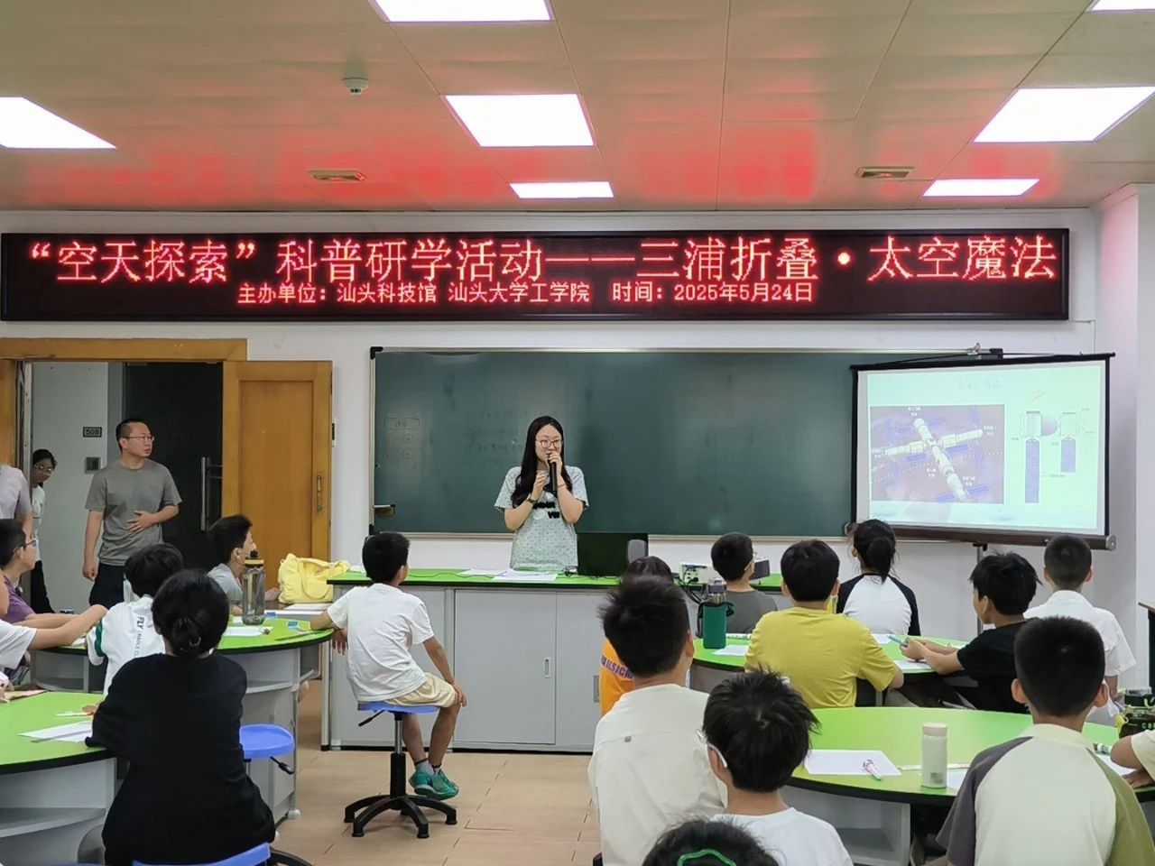 为了让小朋友们更直观地了解三浦折叠的实际应用,赵翊含为大家播放了天宫空间站的实景影像。影像中,太阳能电池翼在太空中缓缓展开、高效运作的壮观场景,引得小朋友们阵阵惊叹,他们对科学的好奇心和探索欲被瞬间点燃。