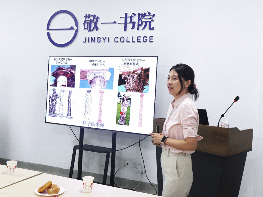 活动伊始,张翠娜用幽默风趣的语言,让同学们思考对比多利克、艾奥尼、科林斯柱式的不同,并通过灵感图片讲解各个柱式的风格。此外,还以哈工大建筑公司、哈铁文化宫、东北烈士纪念馆为例,总结发现它们的的柱形与古希腊建筑相似,体现了哈尔滨建筑对古希腊文化的传承。