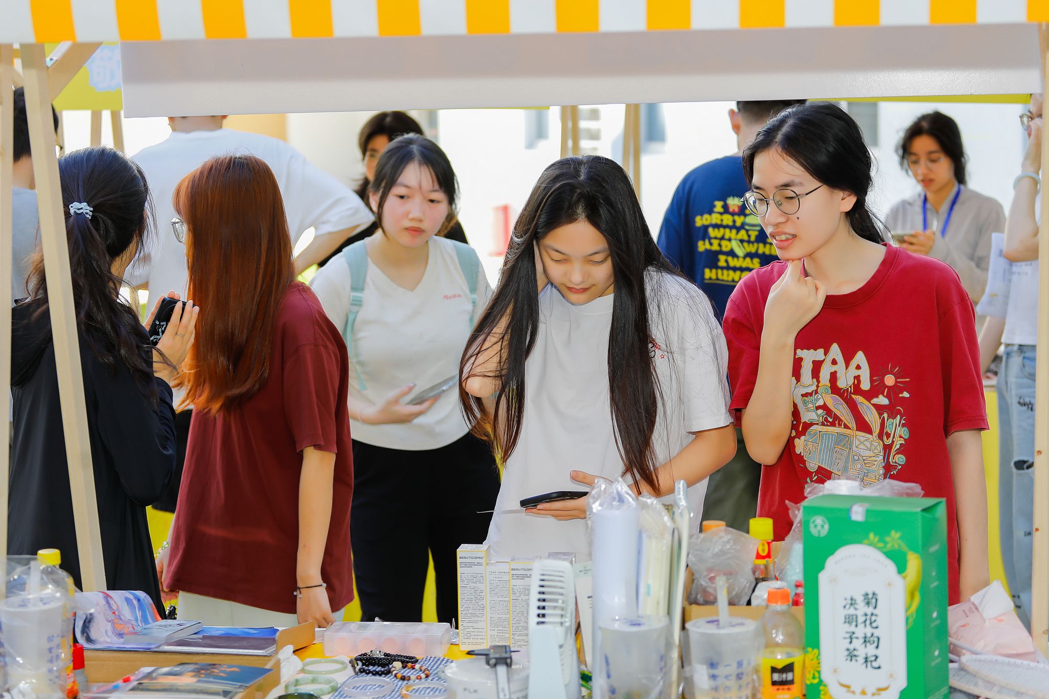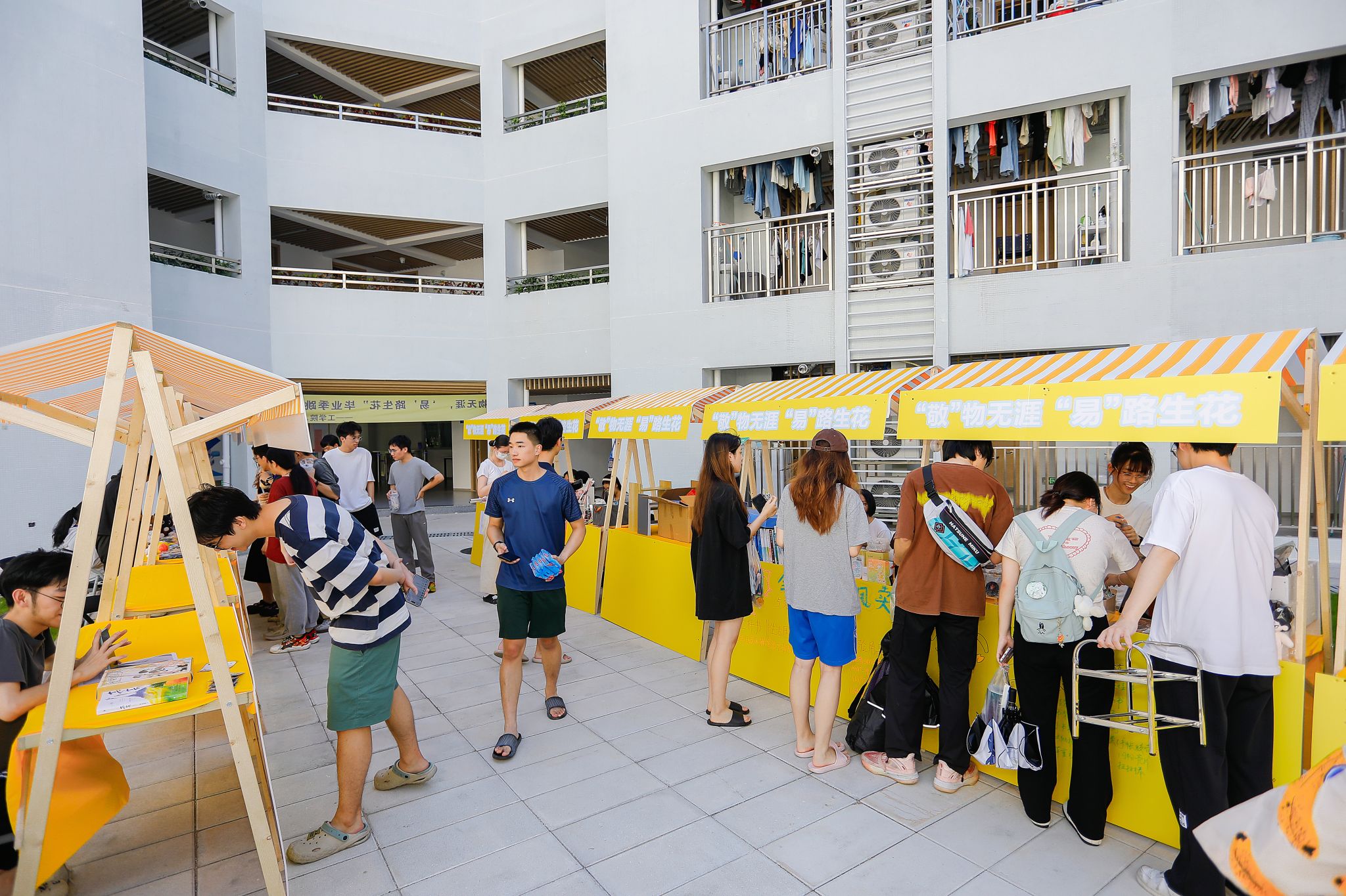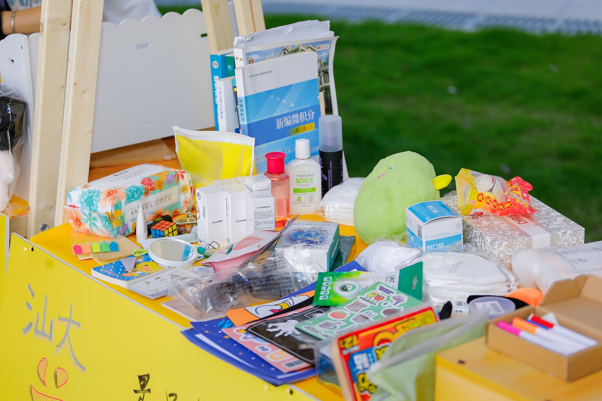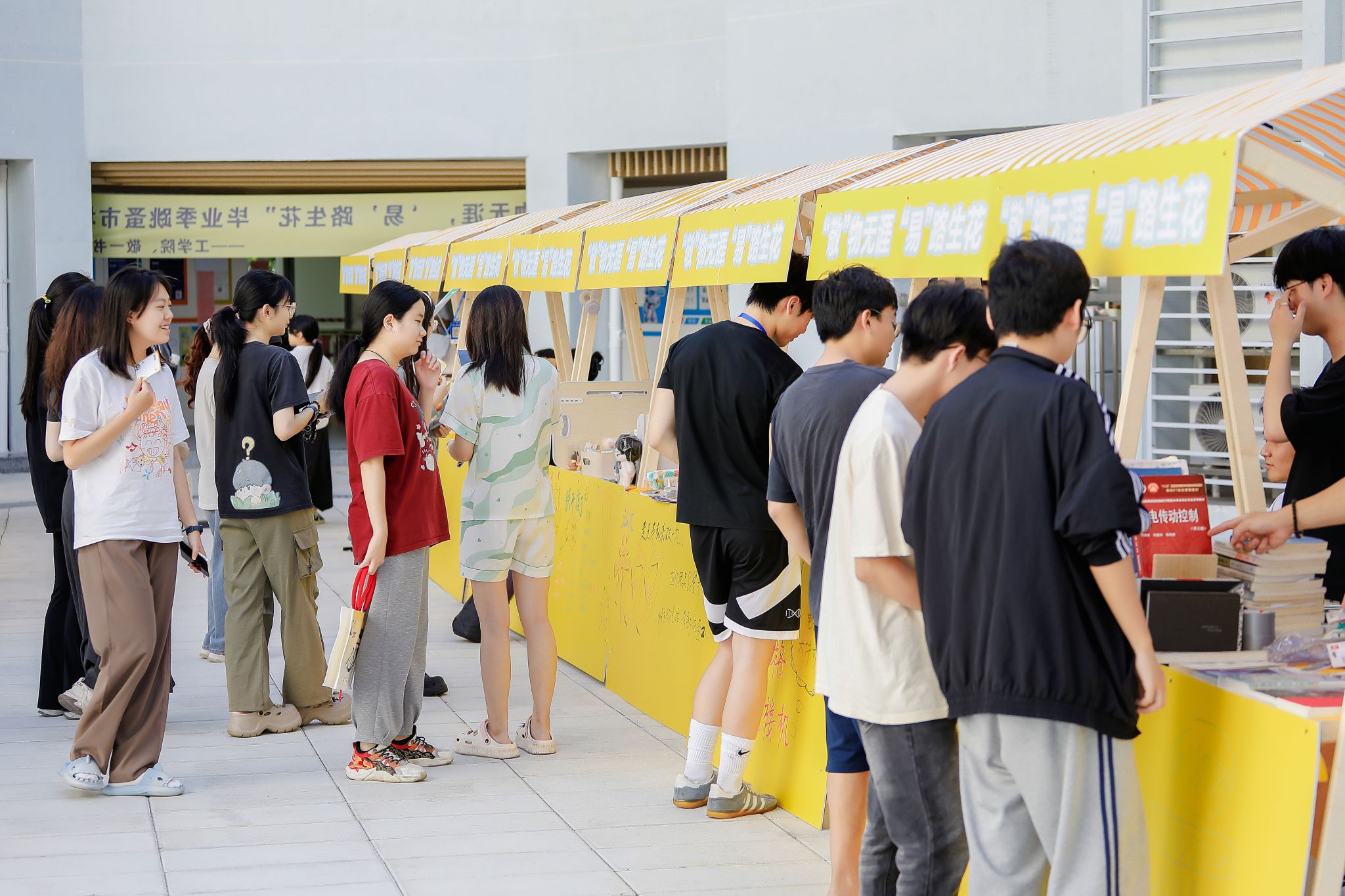 瞧!摊主们早早就来到现场准备。阳光炙热,却挡不住现场的火爆人气。摊位上整齐摆放着琳琅满目的物品,陪伴毕业生度过无数日夜的专业书籍,书页间还留着密密麻麻的笔记;充满文艺气息的手工艺品,凝结着创作者的奇思妙想;还有各种可爱的玩偶、实用的小家电......那些承载着青春记忆的旧物,在一场场讨价还价中找到了新归宿。跳蚤市场是一个充满爱与温情的纽带,连接着不同年级的同学,让校园里的情谊代代相传。