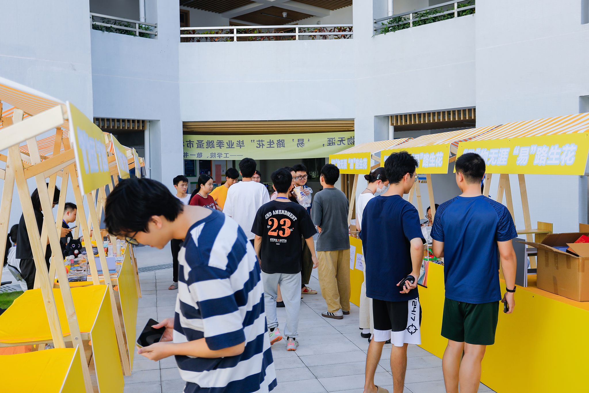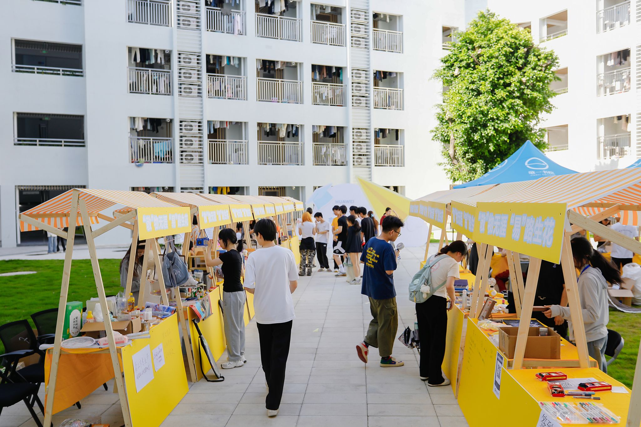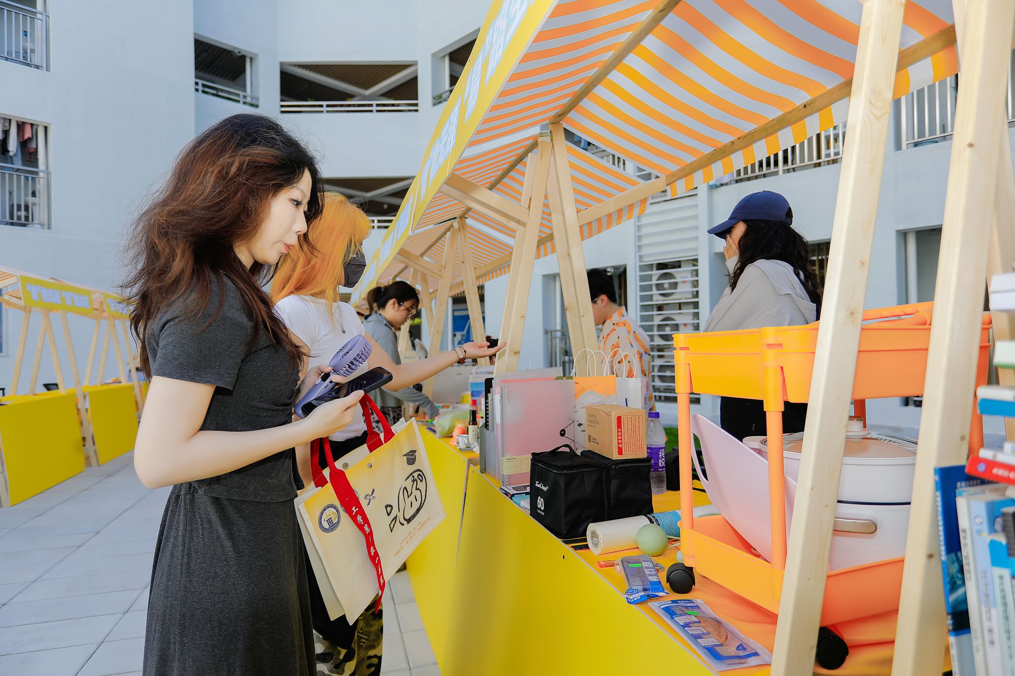 瞧!摊主们早早就来到现场准备。阳光炙热,却挡不住现场的火爆人气。摊位上整齐摆放着琳琅满目的物品,陪伴毕业生度过无数日夜的专业书籍,书页间还留着密密麻麻的笔记;充满文艺气息的手工艺品,凝结着创作者的奇思妙想;还有各种可爱的玩偶、实用的小家电......那些承载着青春记忆的旧物,在一场场讨价还价中找到了新归宿。跳蚤市场是一个充满爱与温情的纽带,连接着不同年级的同学,让校园里的情谊代代相传。