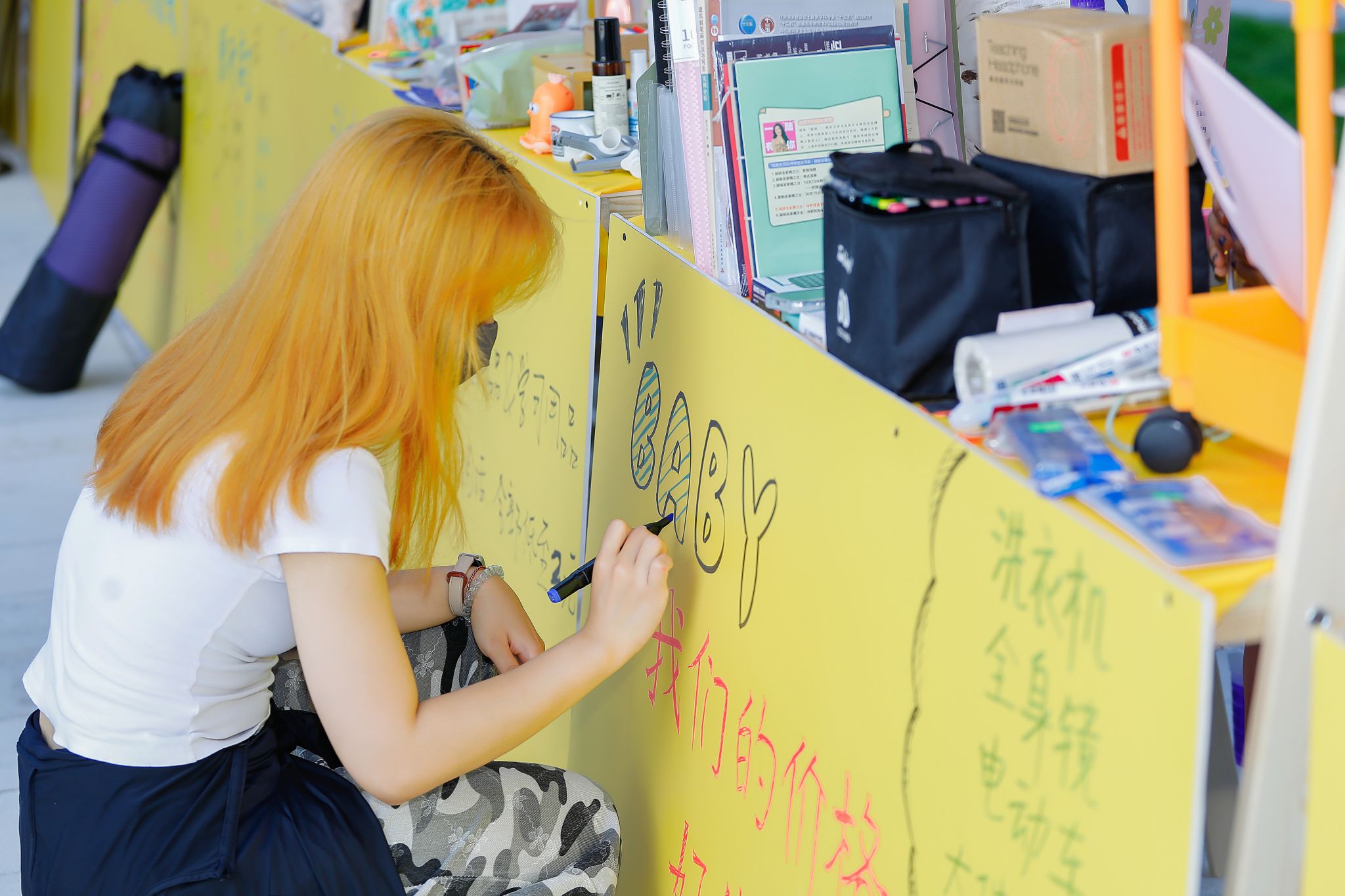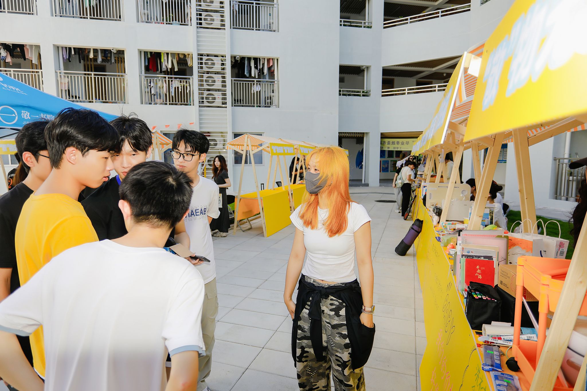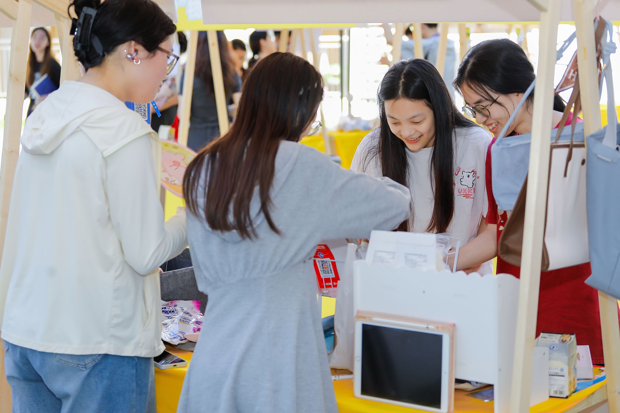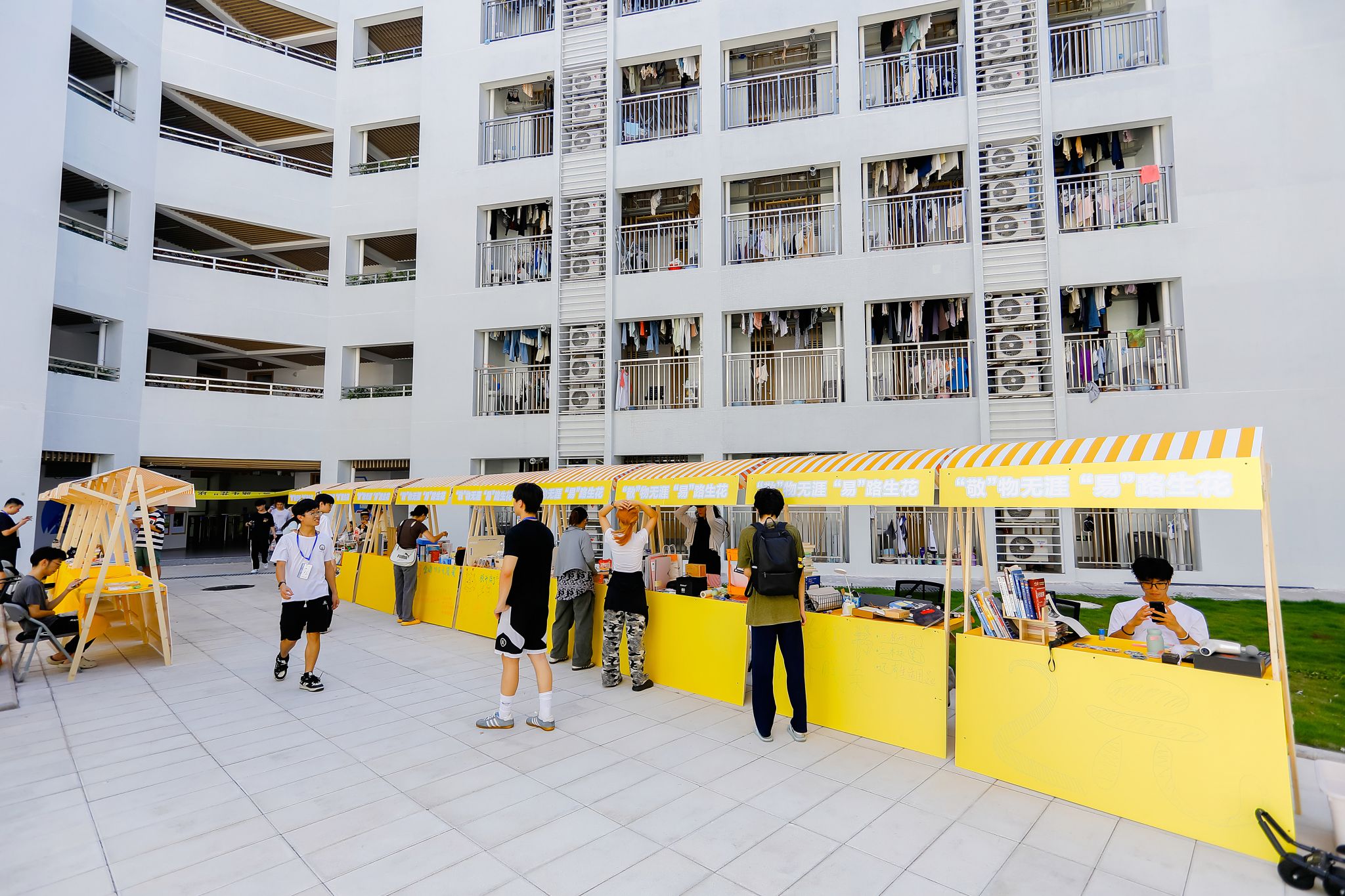 瞧!摊主们早早就来到现场准备。阳光炙热,却挡不住现场的火爆人气。摊位上整齐摆放着琳琅满目的物品,陪伴毕业生度过无数日夜的专业书籍,书页间还留着密密麻麻的笔记;充满文艺气息的手工艺品,凝结着创作者的奇思妙想;还有各种可爱的玩偶、实用的小家电......那些承载着青春记忆的旧物,在一场场讨价还价中找到了新归宿。跳蚤市场是一个充满爱与温情的纽带,连接着不同年级的同学,让校园里的情谊代代相传。