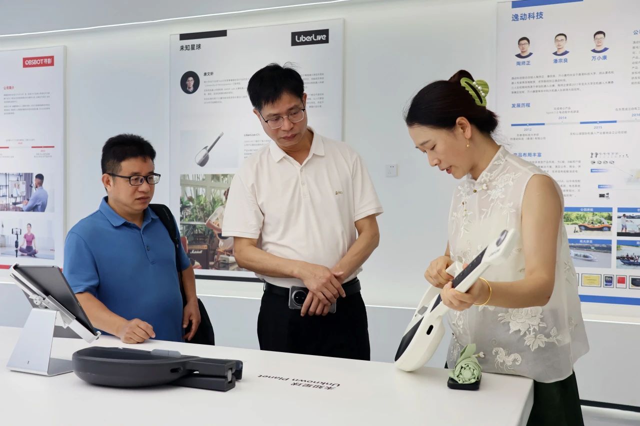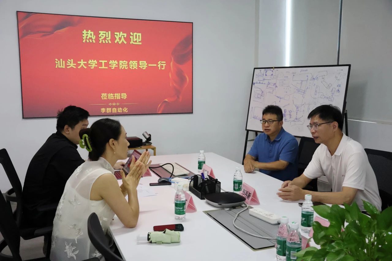 在李群自动化技术有限公司,一行人深入了解松山湖机器人产业区整体规划与发展方向,通过听取介绍、实地参观等多种方式,全面把握基地内产业集聚态势与技术创新成果。随后的座谈会上,郑再新介绍公司学科布局、专业特色及人才培养亮点,包能胜着重分享公司科研成果转化的特色路径,表达公司与基地企业在人才供给、科研协同等维度的合作意愿,企业代表围绕产学研融合项目落地细节展开热烈探讨。