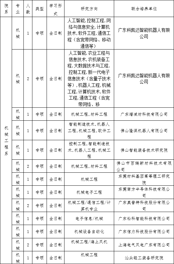 伟德国际victor1946与佛山基地(广东科凯达智能机器人有限公司、广东增减材科技有限公司、佛山隆深机器人有限公司、佛山智能装备技术研究院、佛山市百瑞新材料技术有限公司)、东莞基地(东莞材料基因高等理工研究院、东莞南方半导体科技有限公司、广东奥普特科技股份有限公司、广东松科智能科技有限公司、广东信力科技股份有限公司)和汕头基地(上海电气风电广东有限公司、汕头轻工装备研究院、汕头市俊国机电科技有限公司)进行联合培养招生。