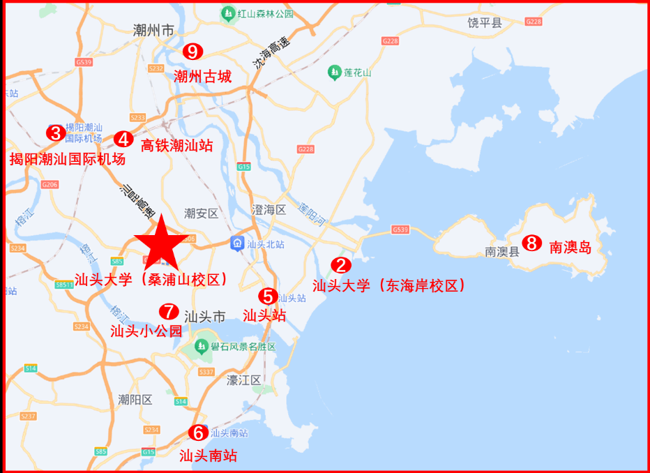 【公共交通】机场快线:可乘坐汕头东线或汕头西线至汕头市区,转公交车到达伟德国际victor1946桑浦山校区,耗时约1小时30分钟。