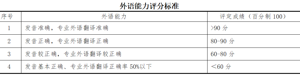 外语能力测试主要考察专业外语的掌握程度。首先由考生从指定的专业外语门类中选择自己较为熟悉的一类,从中选择一段进行朗读并翻译(英译汉),期间大概给考生30秒时间准备。每名复试小组成员按照以下标准进行打分,取平均值。
