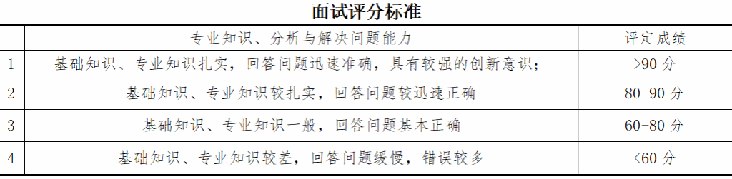 ②考生制作PPT汇报自己的毕业设计,或者课程设计,或者工作中遇到的一个项目,然后由教师提问,一般不少于2个问题,考查员工对综合基础理论知识的运用、分析解决问题的能力和实验技能,了解考生目前的毕业(课程)设计、工作和对遇到的有关问题解决的情况。根据考生回答的情况,每名复试小组成员按照以下标准进行打分,取平均值。