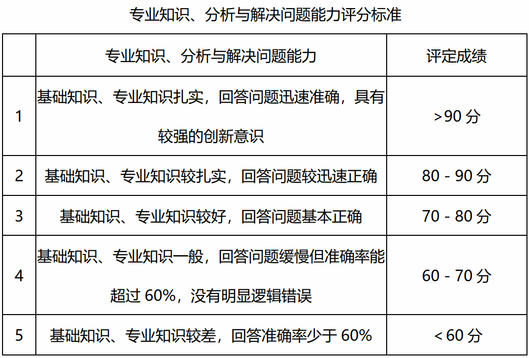 根据考生回答的情况, 每名复试小组成员按照以下标准进行打分,取平均值。