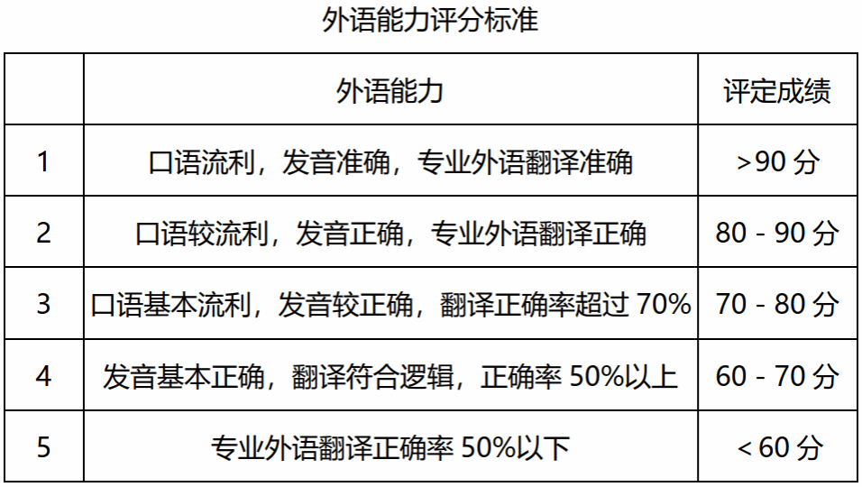 外语能力测试主要考察语法与用词的准确性、词汇的丰富程度、发音的准确性、专业外语的掌握程度等。具体分为口语测试和专业外语两部分。首先由考生先进行3分钟左右的英文自我介绍,然后再由考生从指定的专业外语题目中随机抽取一道,进行作答(主要是朗读并翻译),期间给考生大约30秒时间准备。每名复试小组成员按照以下的标准进行打分,取平均值。