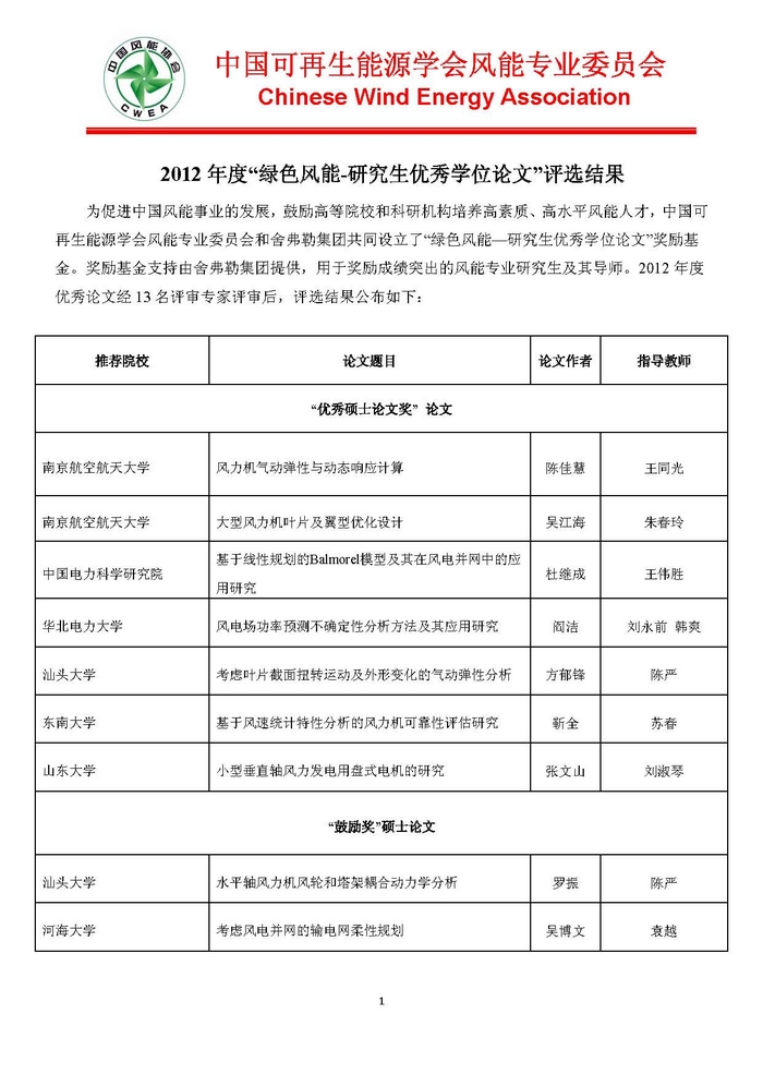 伟德国际1946亚洲版研究生喜获2012年度“绿色风能-研究生优秀学位论文”奖 2012-12-31 09:11:09