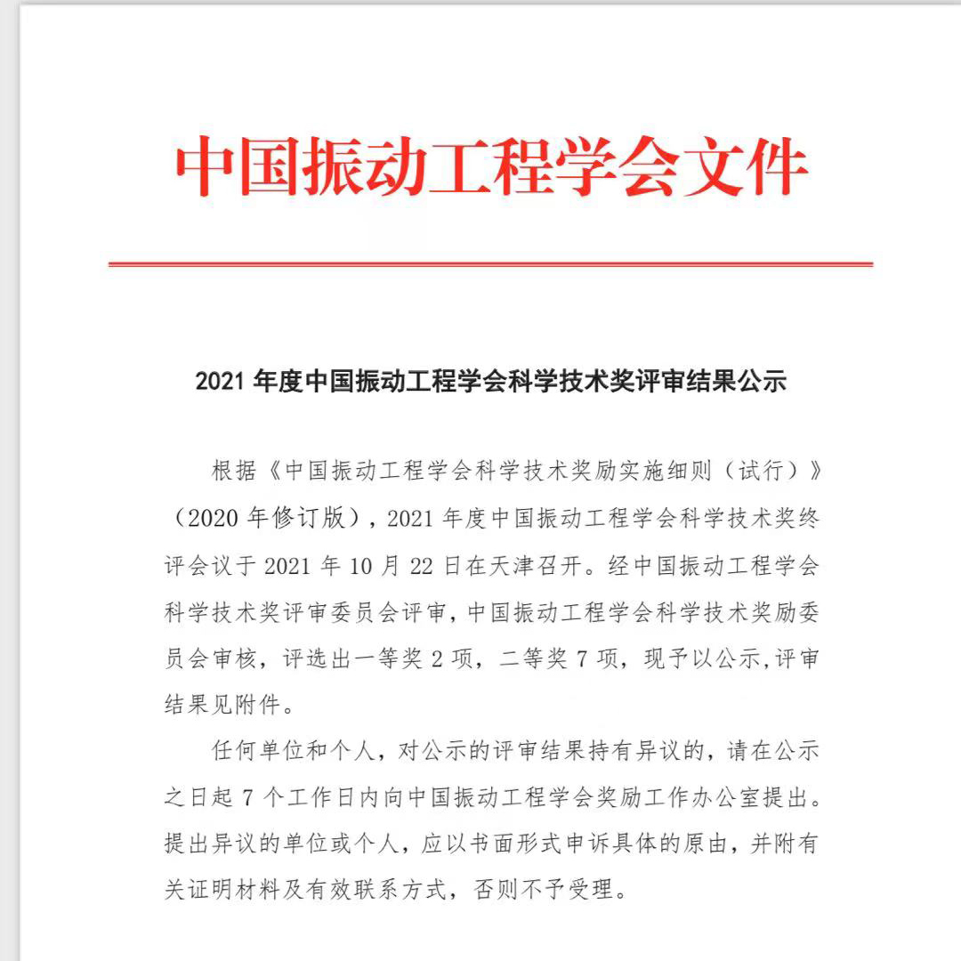伟德国际victor1946荣获2021年度中国振动工程学会科学技术奖一等奖 2021-11-10 19:30:32