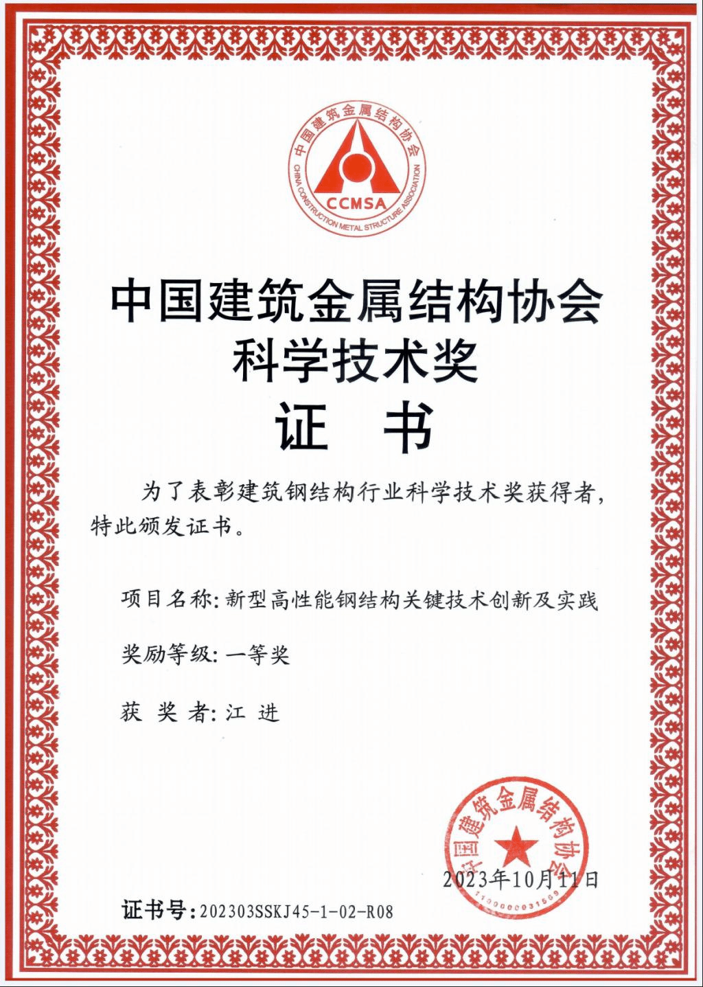 喜讯:伟德国际1946亚洲版教师江进获得中国建筑金属结构协会科学技术奖一等奖 2023-11-08 15:38:17